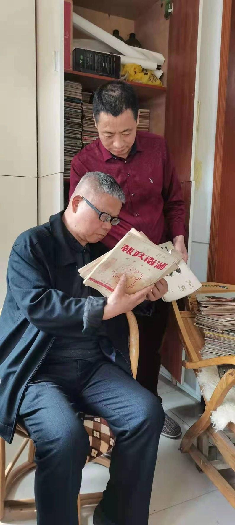 马占山(右)向记者刘衍清展示创刊号